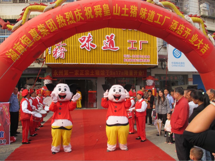 9月17日上午,凤凰路与湖塘路口转角处一片欢腾,彩球高悬,锣鼓喧天。永州市首家以“舜皇山土猪”为主题的土菜馆——舜皇山土猪工厂酒店开业庆典在这里隆重举行。